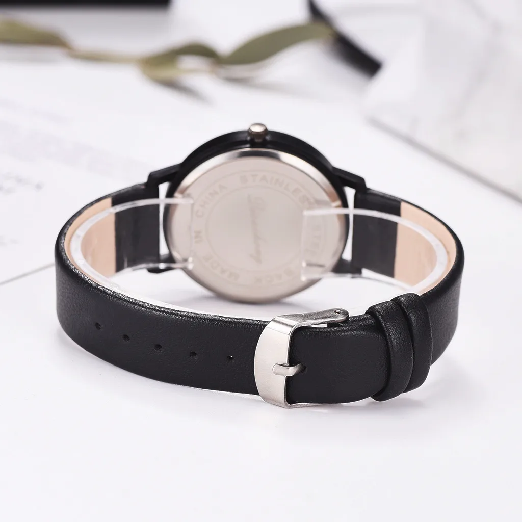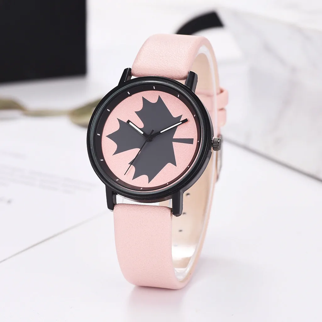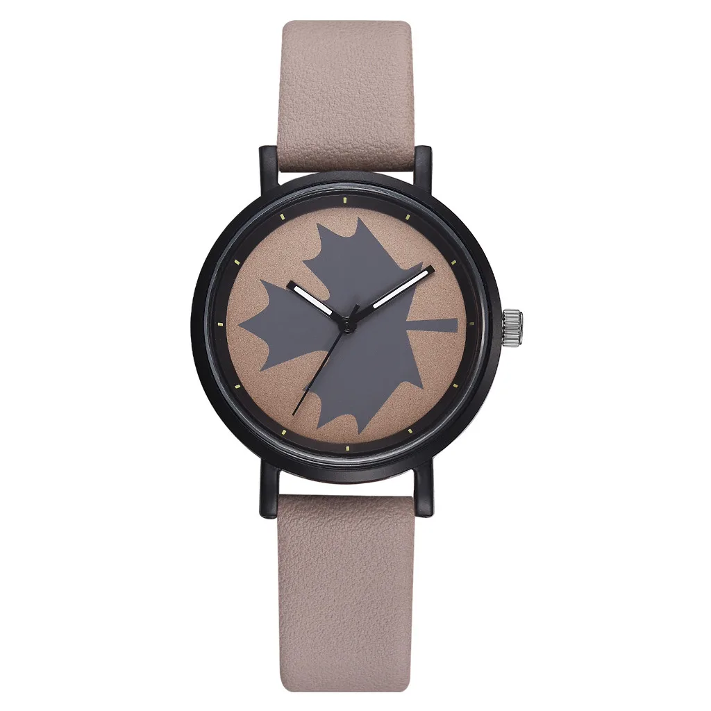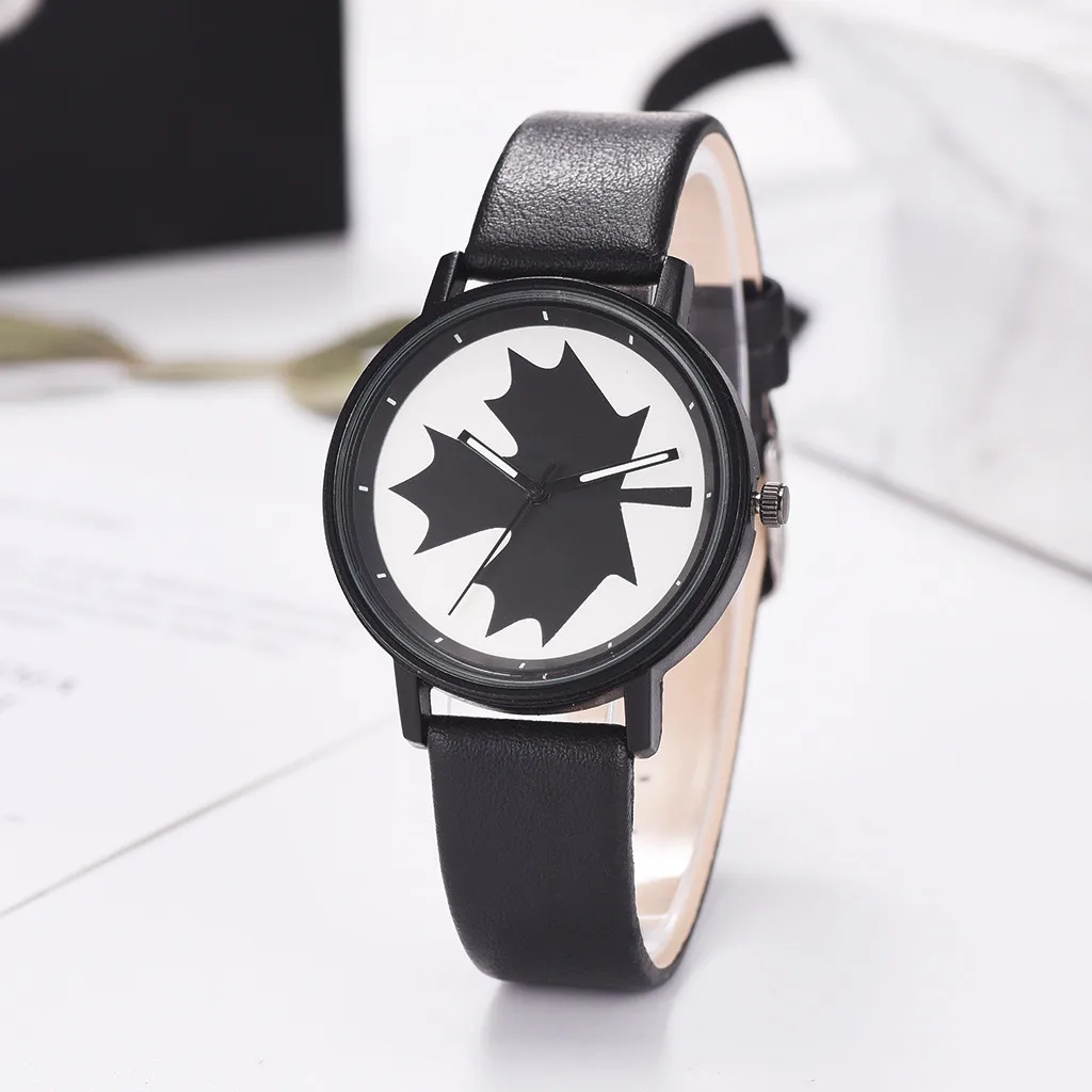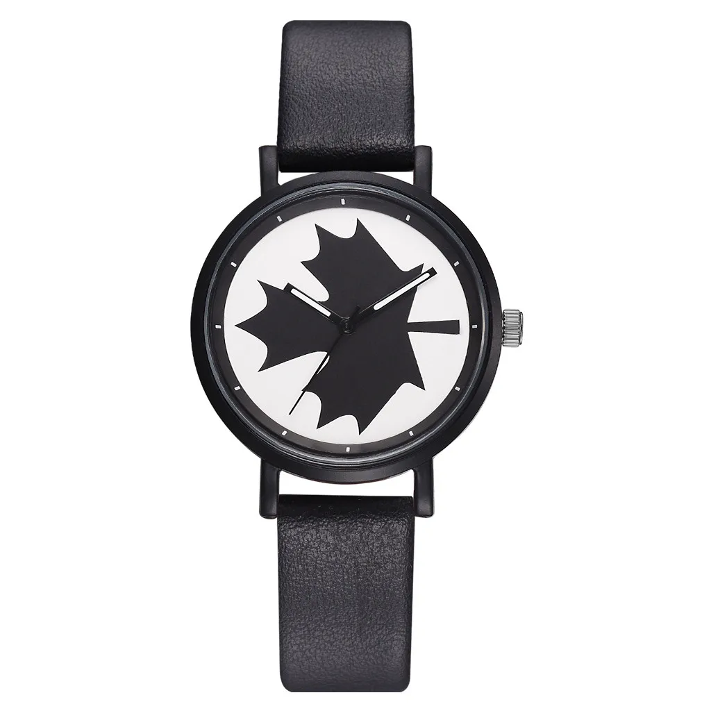 Modern Watch Women Black Maple Leaf Pattern Fashion Quartz Wristwatch High Quality Leather Strap Casual Female Montre Femme@50