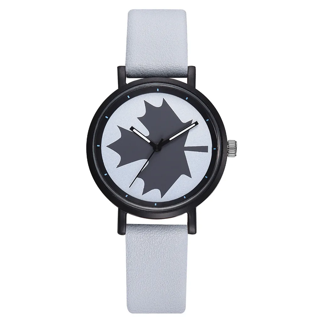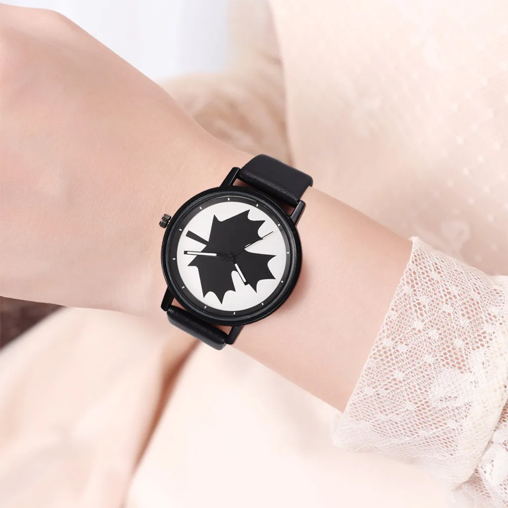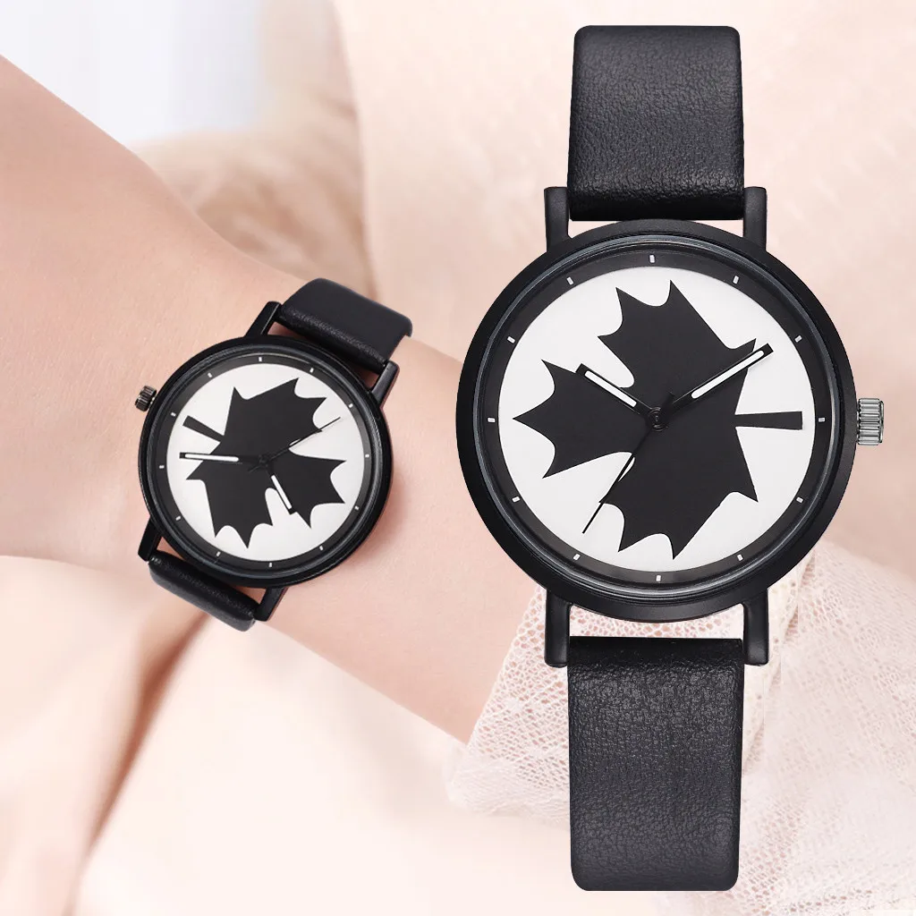 Modern Watch Women Black Maple Leaf Pattern Fashion Quartz Wristwatch High Quality Leather Strap Casual Female Montre Femme