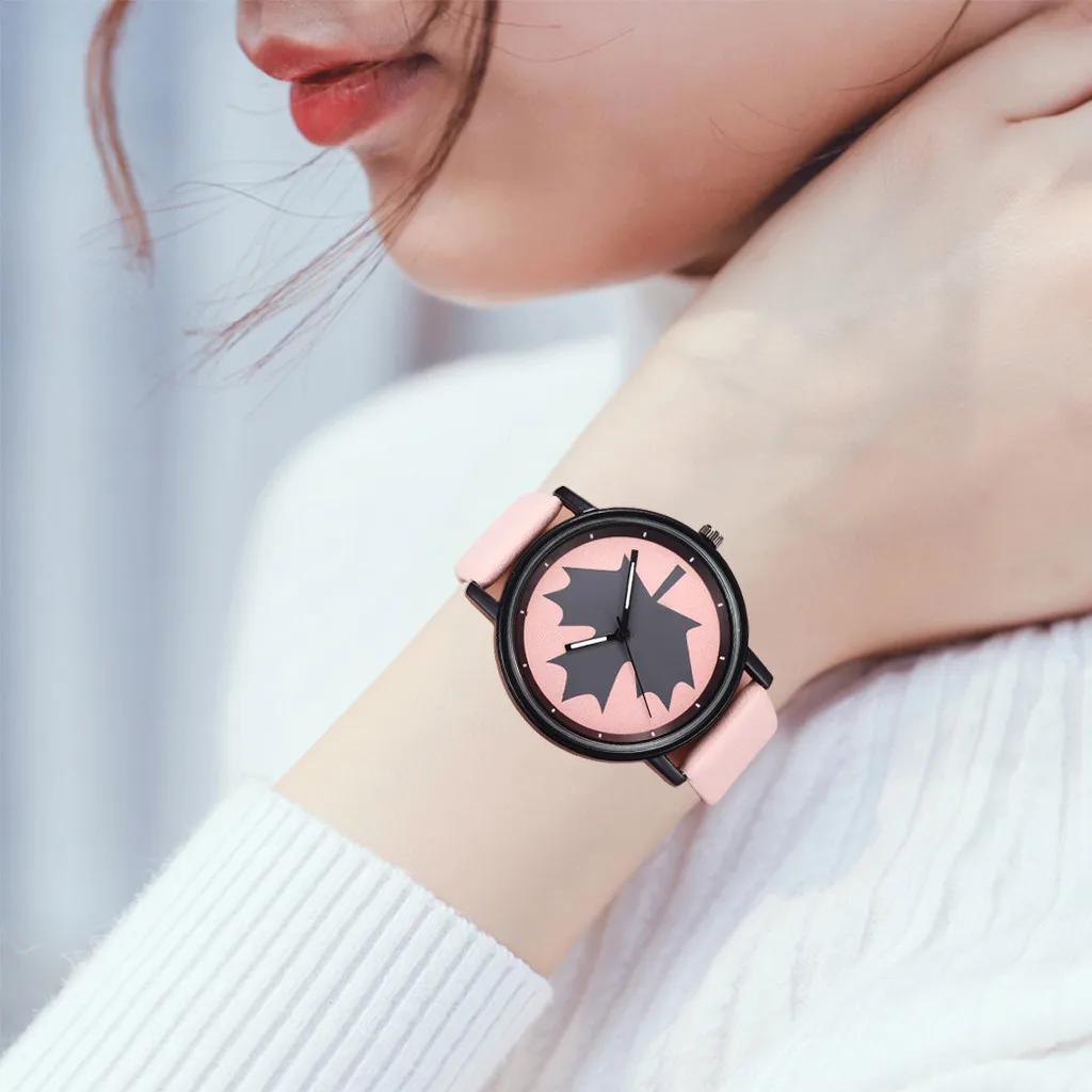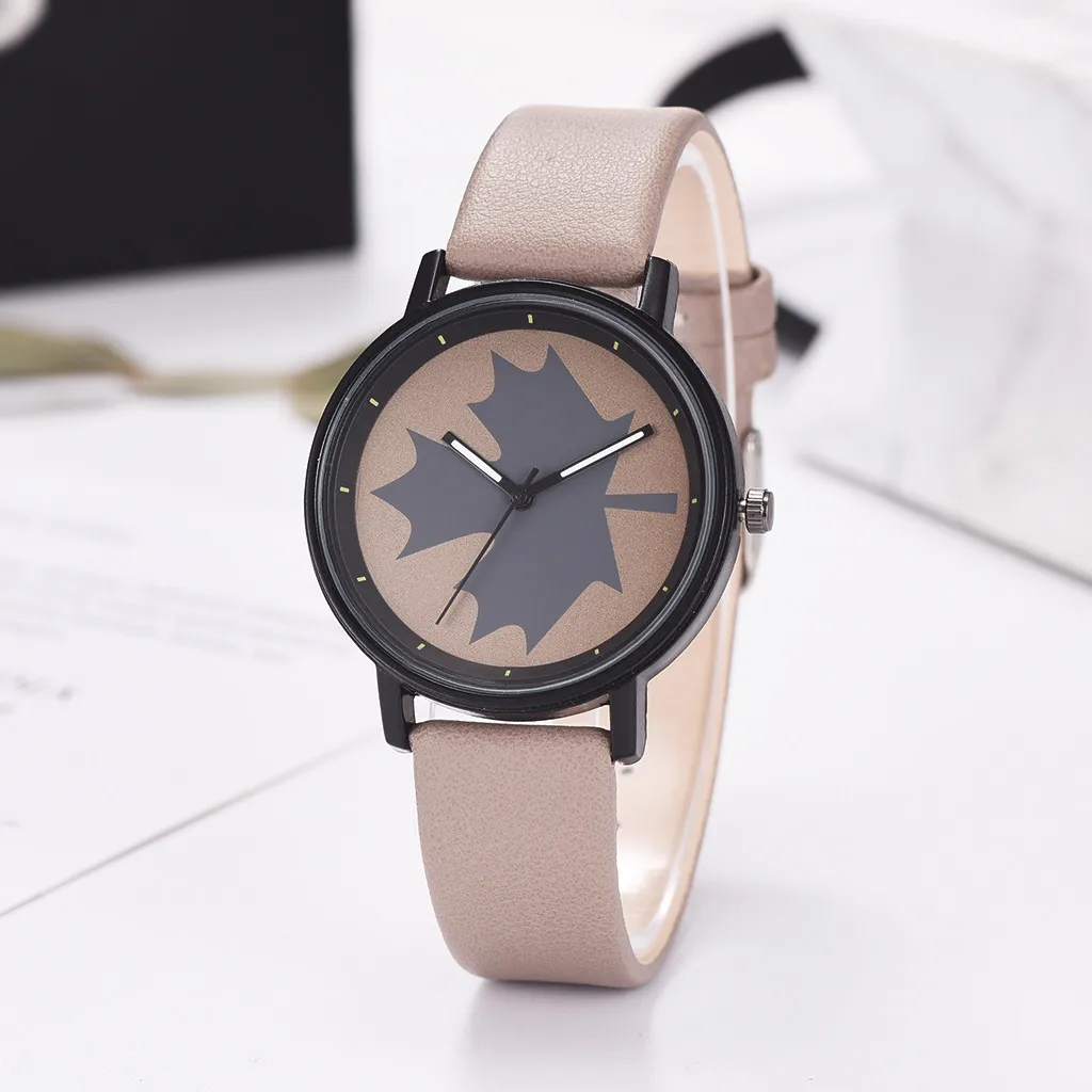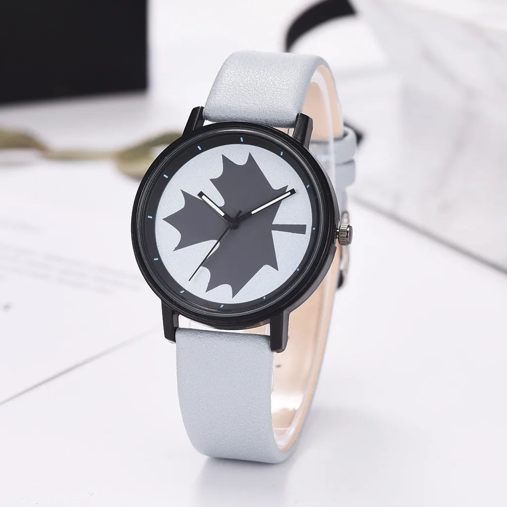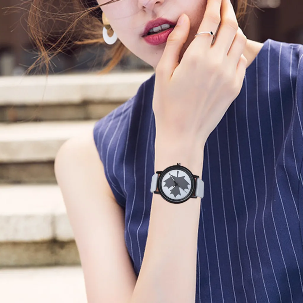 Modern Watch Women Black Maple Leaf Pattern Fashion Quartz Wristwatch High Quality Leather Strap Casual Female Montre Femme