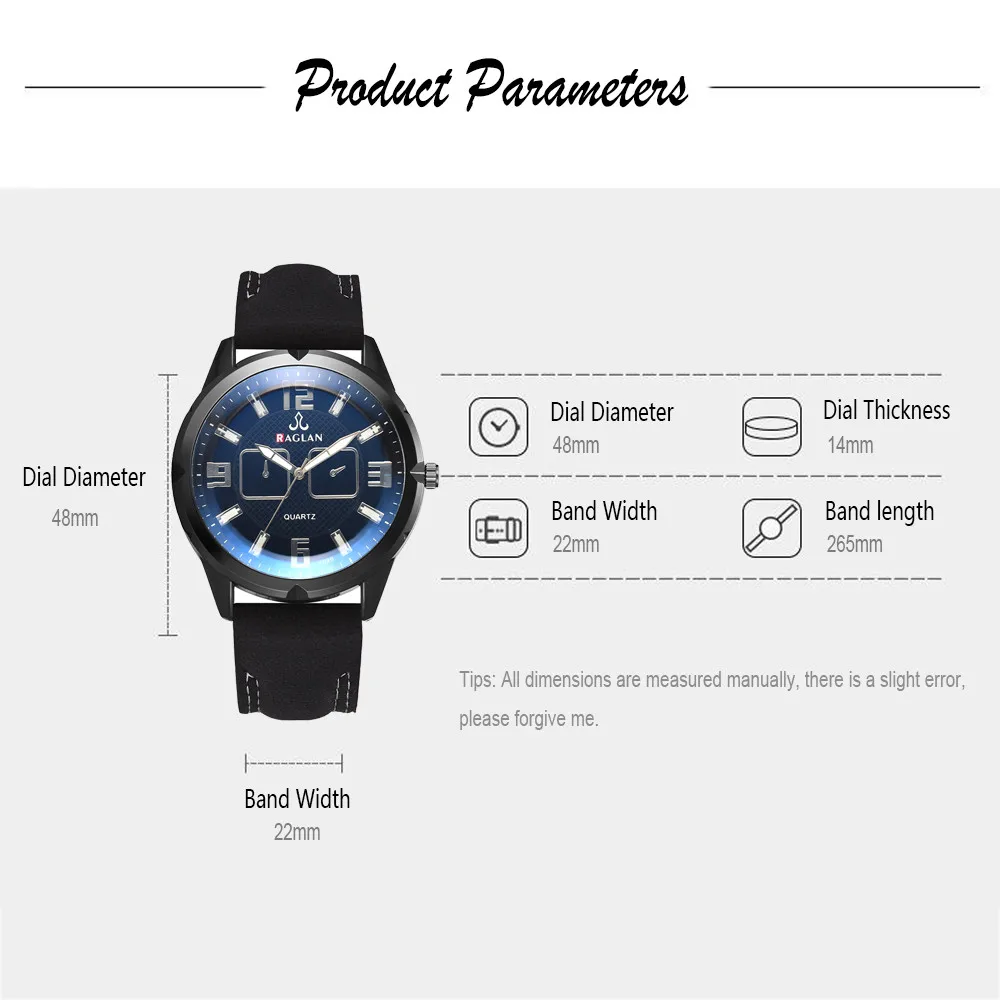 Fashion Men Quartz Watch High Quality Leather Clock Blu Ray Glass Wristwatch Specifications: Display: Pointer Movement: Quartz Band length: 265mm Band Width: 24mm Adjustable pin buckle fastening Quantity:1 Pc Case Diameter: 50mm Dial Shape: Round Case Thickness: 15mm Unique round dial design, very chic and stylish Material:Leather Package includes: 1...