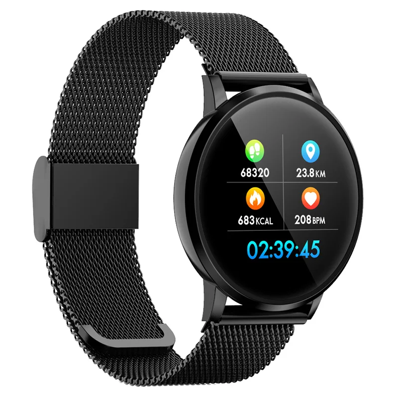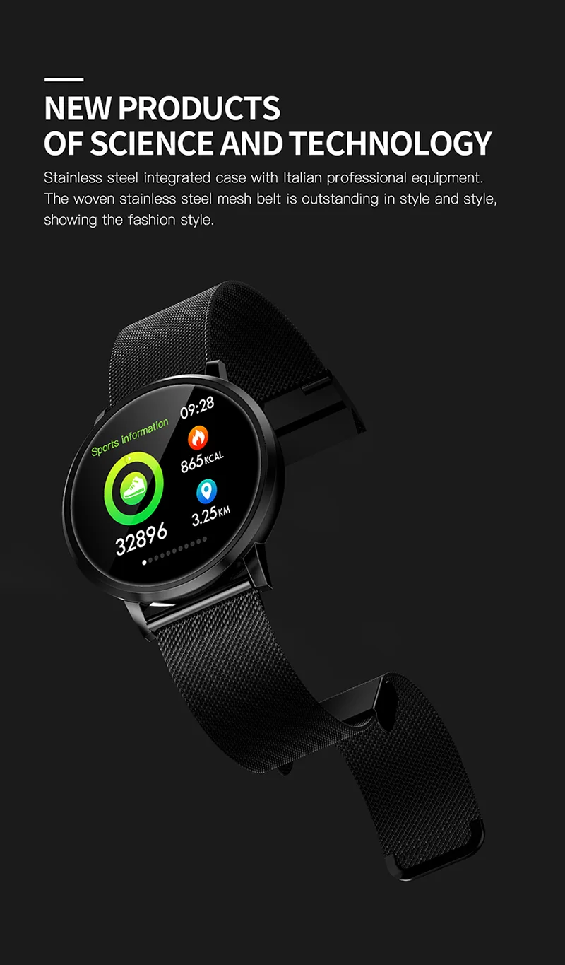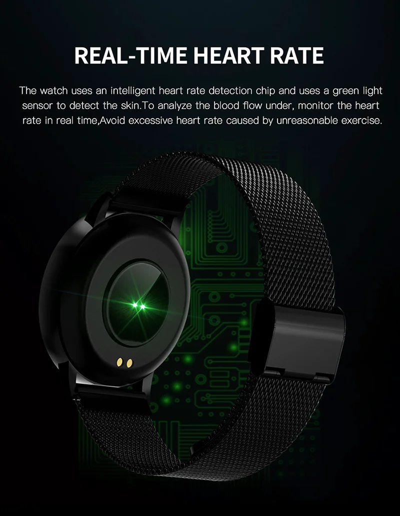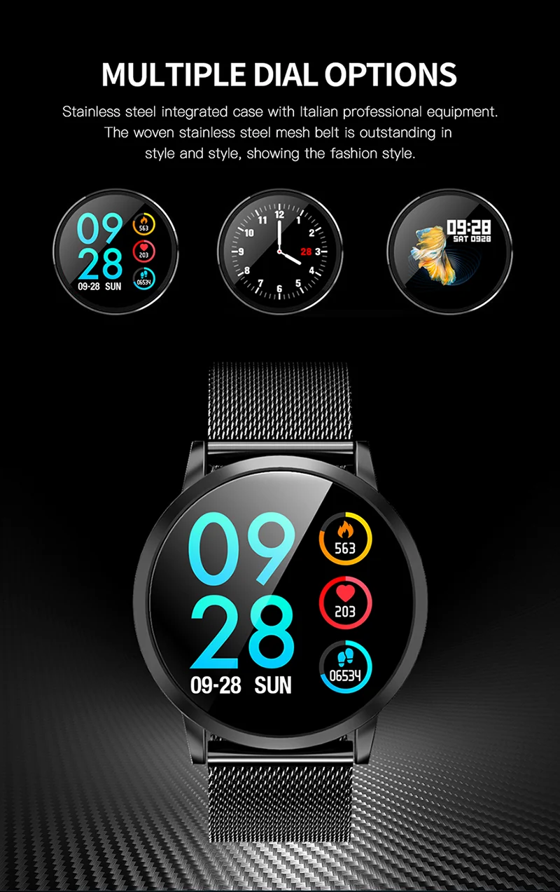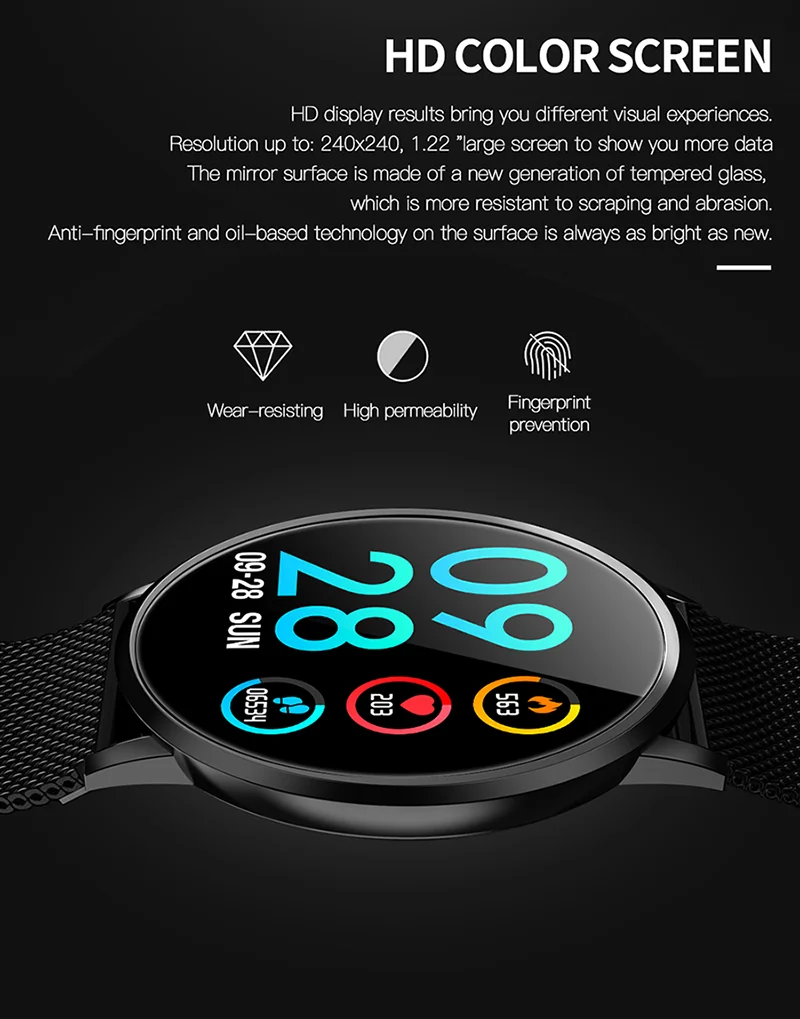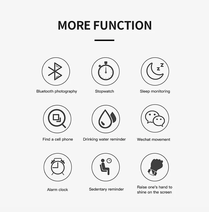 1. Smart watch display function: time display, battery icon display, date display, week display, standard motion function (step, distance, calorie), heart rate, blood pressure detection, sleep time display, smart alarm clock, stopwatch,Multi-sports mode(walking, running, swimming, badminton, football, 8 sports modes).
