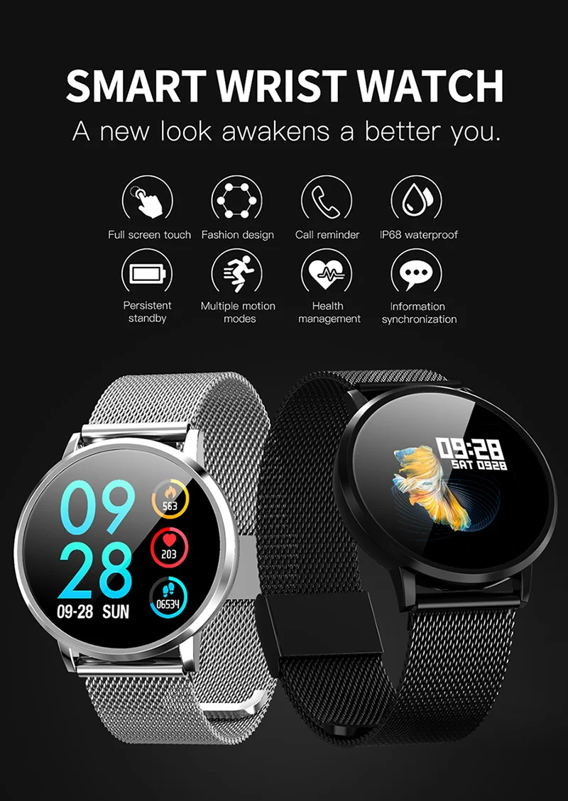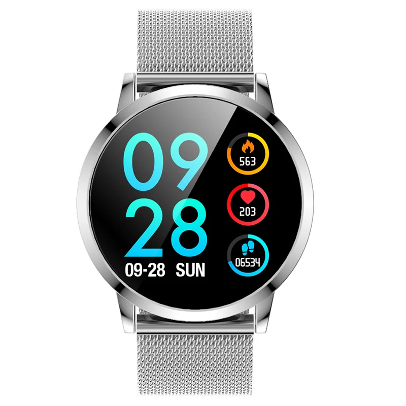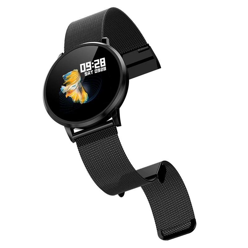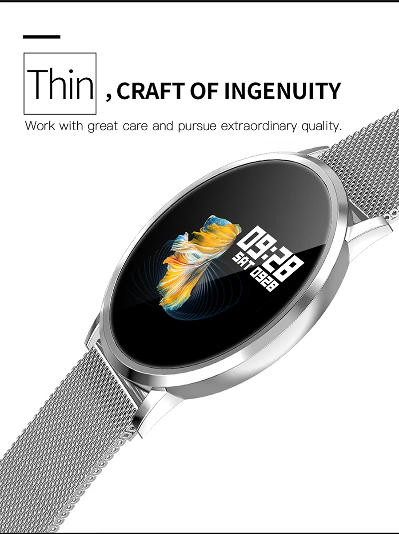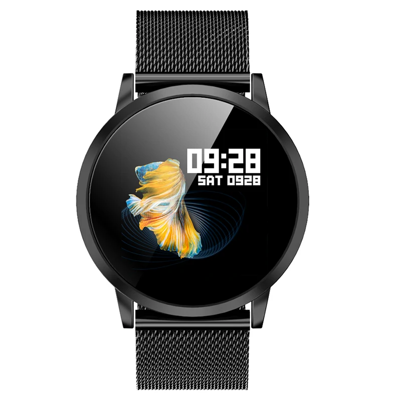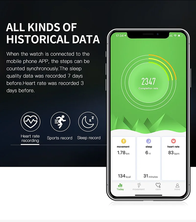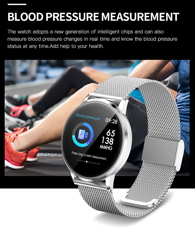 1. Smart watch display function: time display, battery icon display, date display, week display, standard motion function (step, distance, calorie), heart rate, blood pressure detection, sleep time display, smart alarm clock, stopwatch,Multi-sports mode(walking, running, swimming, badminton, football, 8 sports modes).