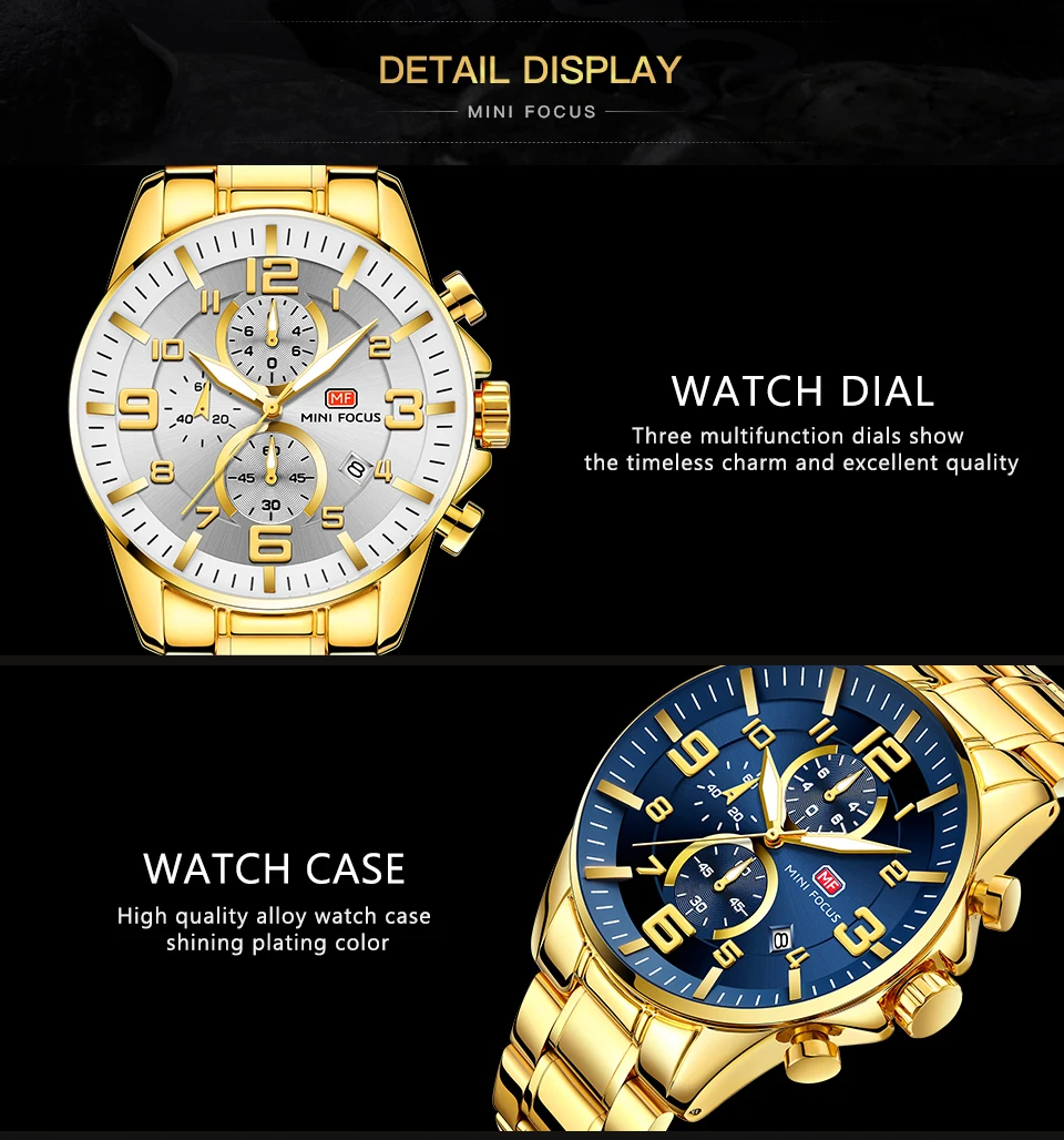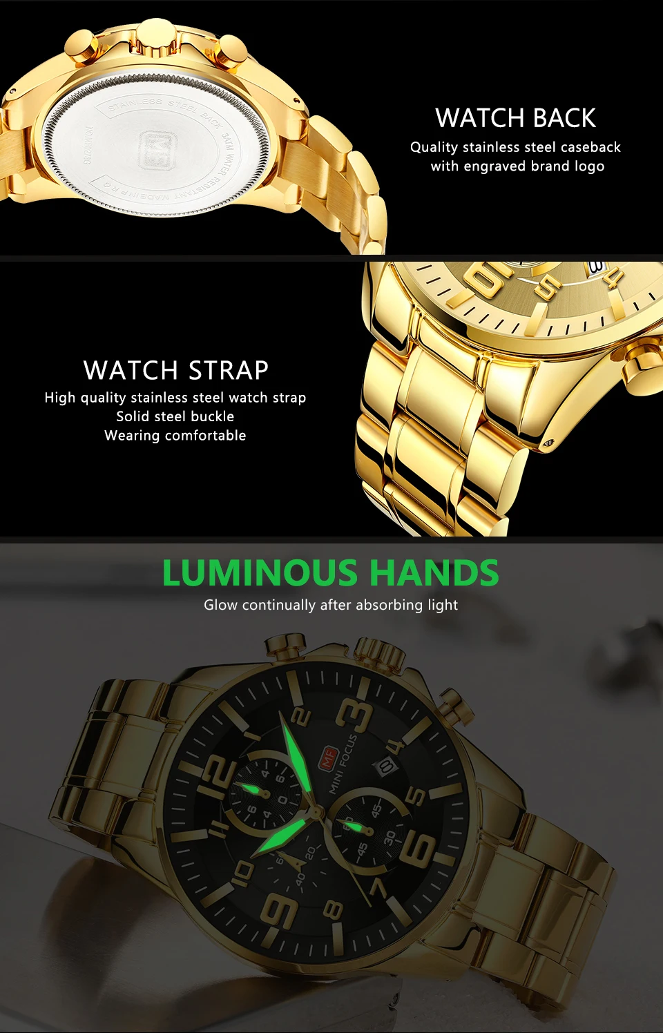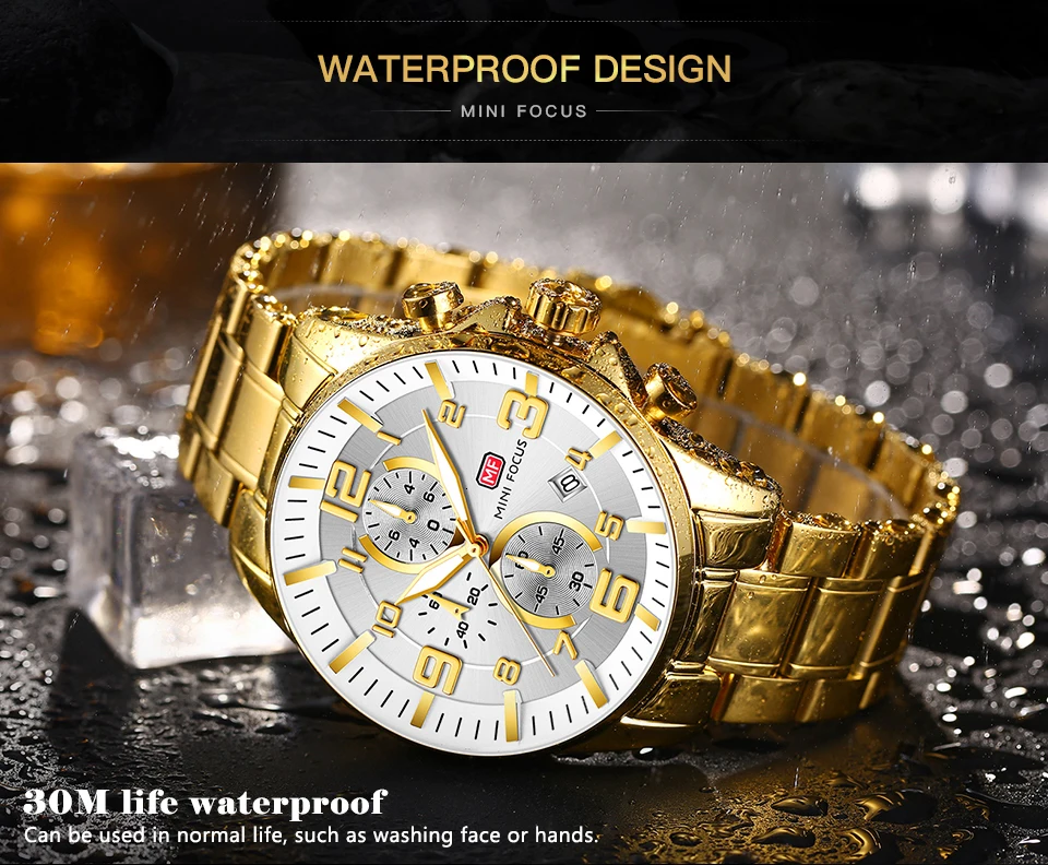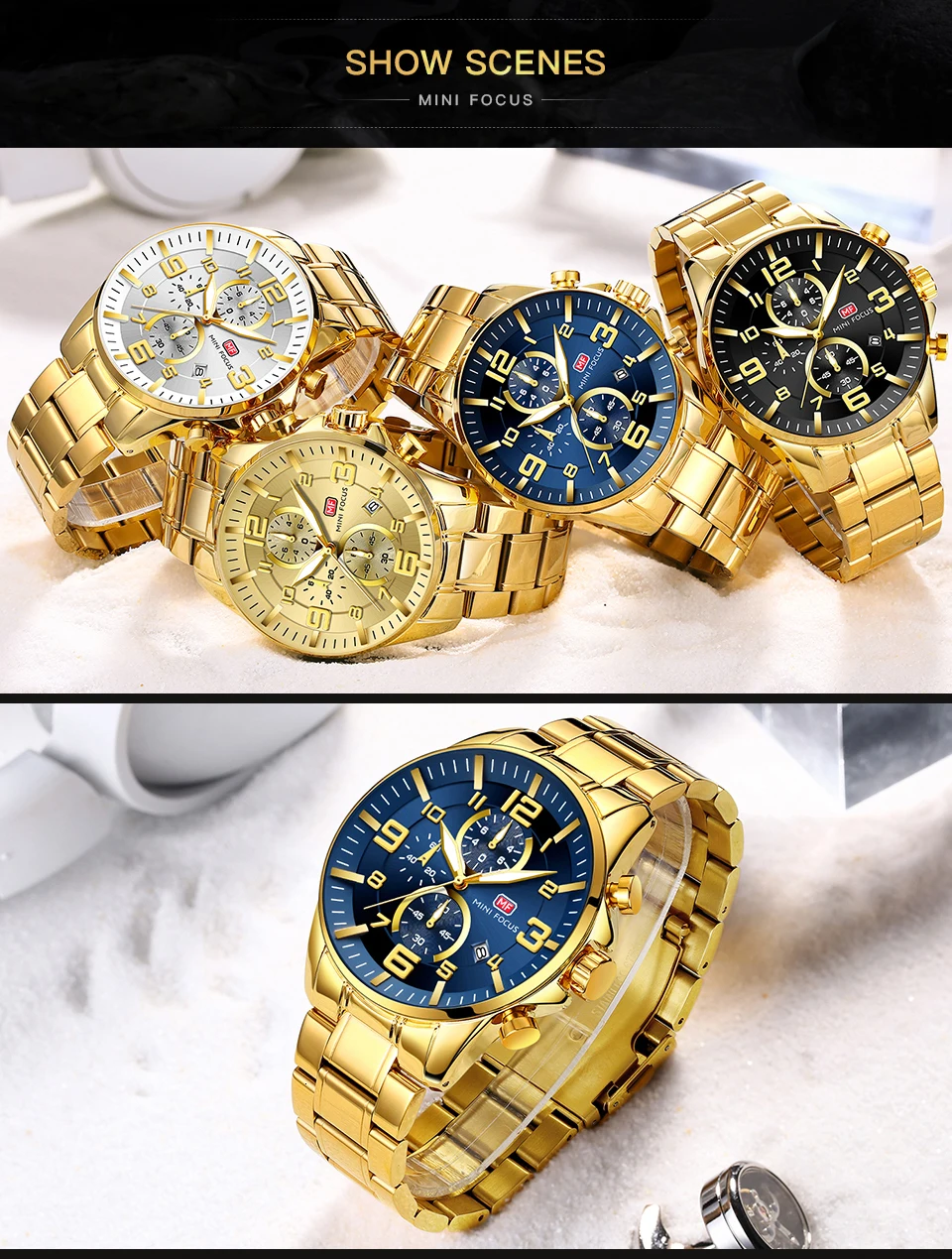 MINIFOCUS Sport Watch Men Luxury Brand Stainless Steel Gold Watch Mens Watches Quartz Chronograph Wrist Watches For Men Business