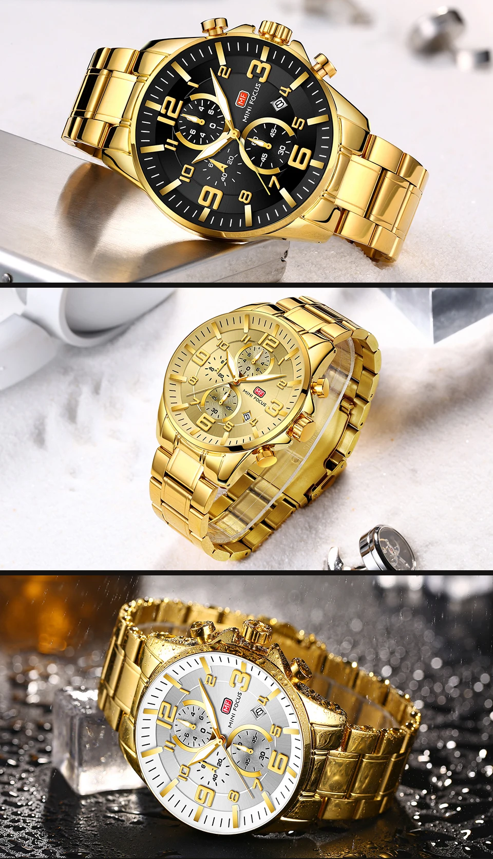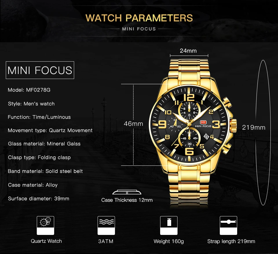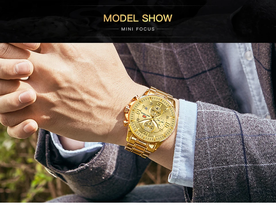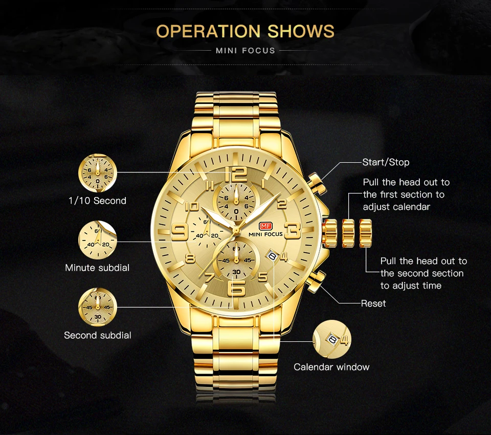 MINIFOCUS Sport Watch Men Luxury Brand Stainless Steel Gold Watch Mens Watches Quartz Chronograph Wrist Watches For Men Business