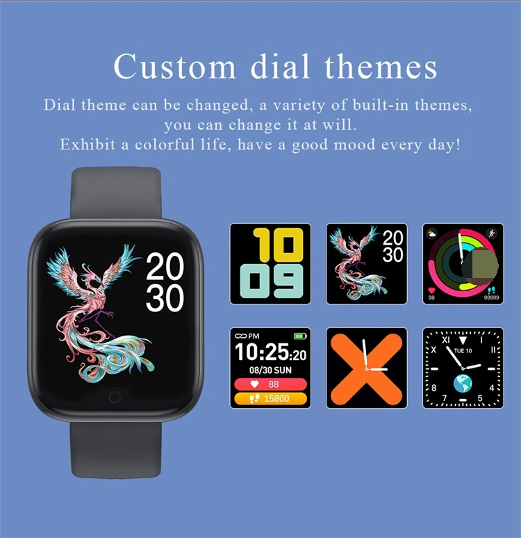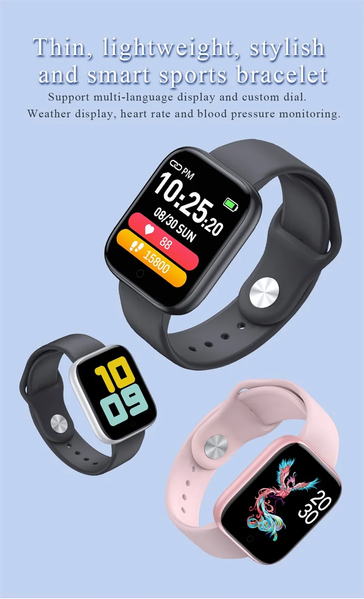 Support multi-language display and custom dial. Weather display,heart rate and blood pressure monitoring.