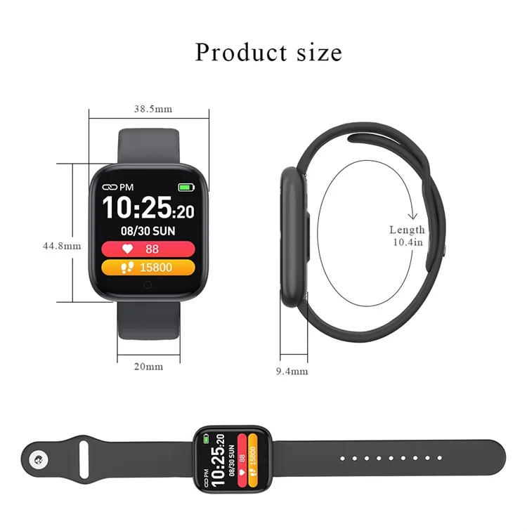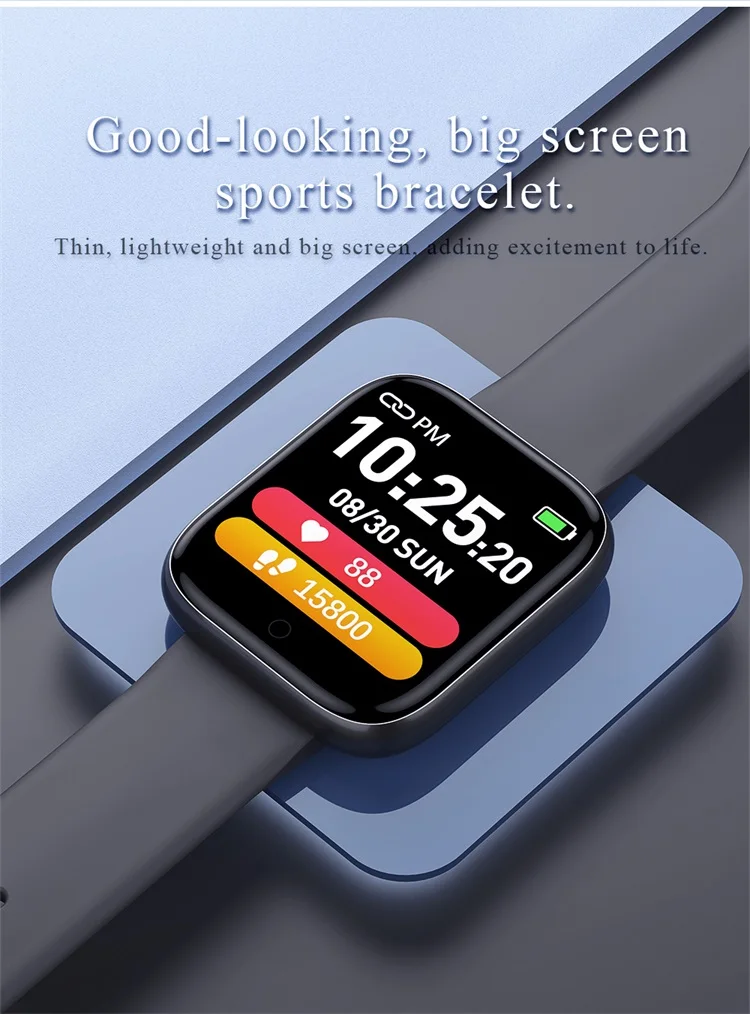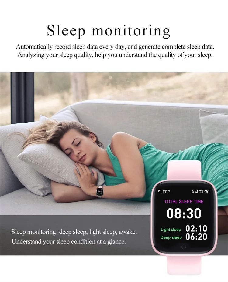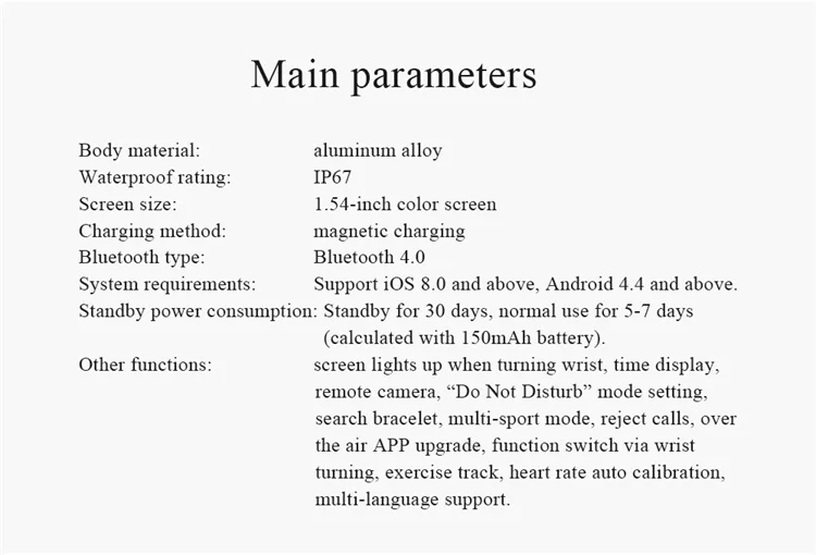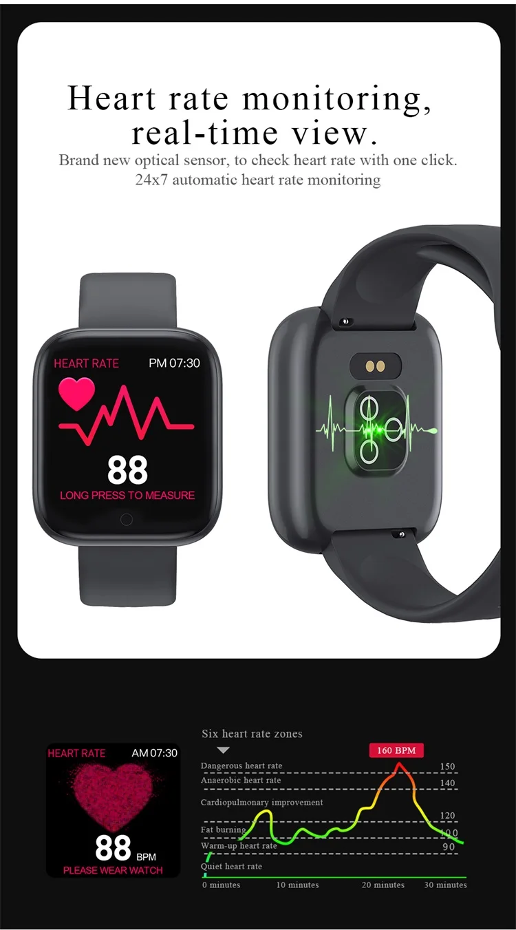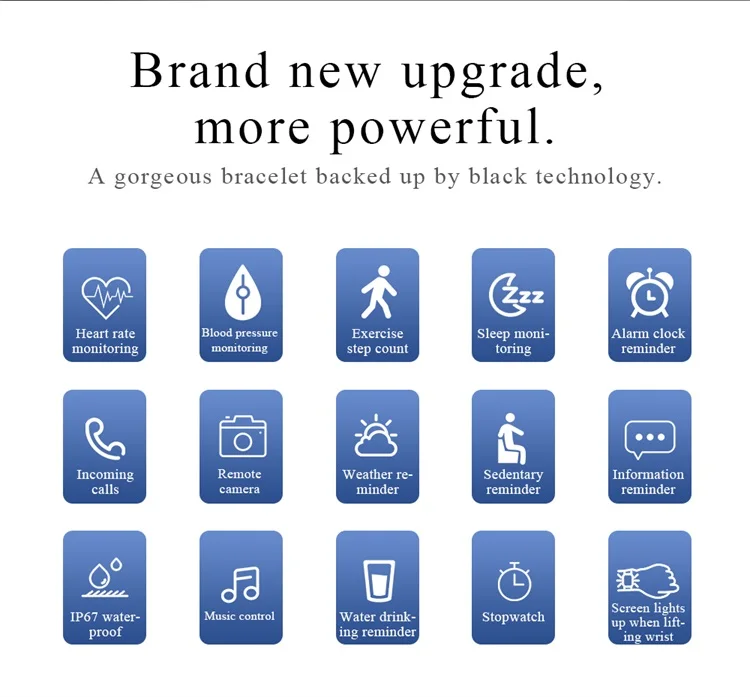 Heart rate monitoring | Blood pressure monitoring Exercise step count | Sleep monitoring Alarm clock reminder | Incoming calls Remote camera | Weather reminder Sedentary reminder | Information reminder IP67 waterproof | Music control Water drinking reminder | Stopwatch Screen lights up when lifting wrist