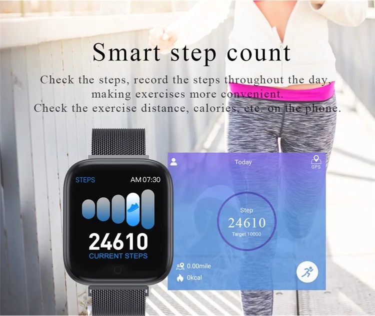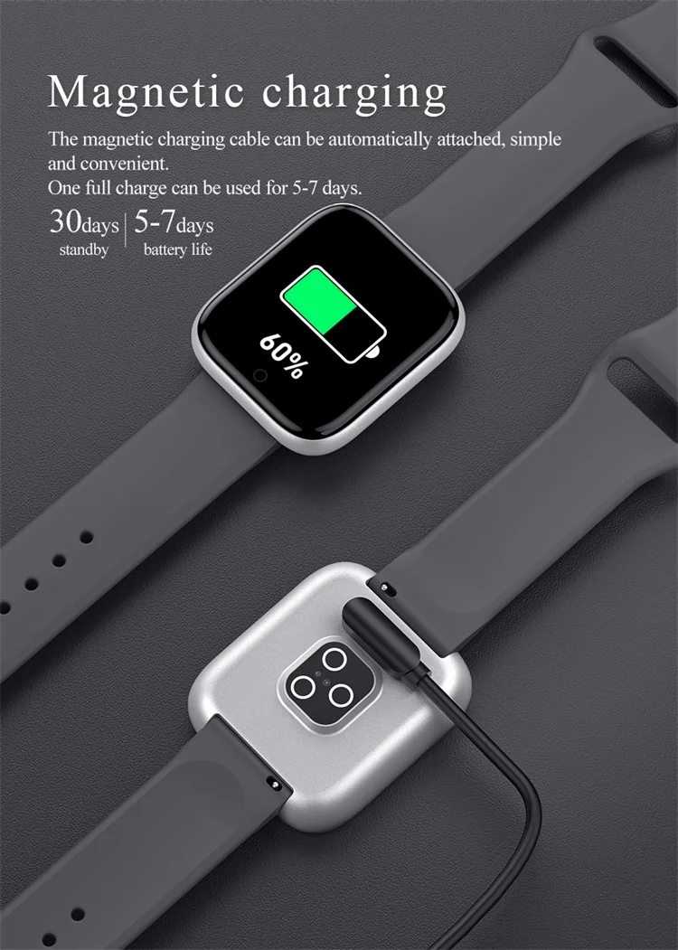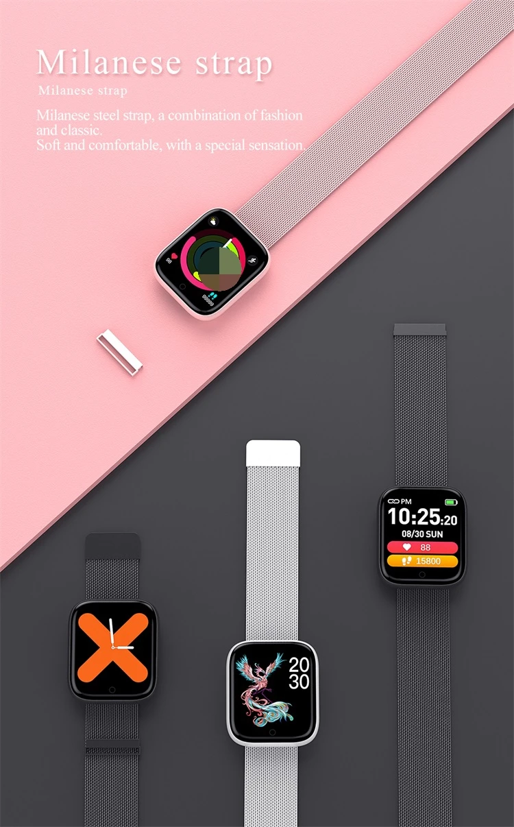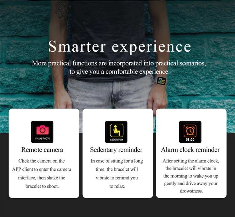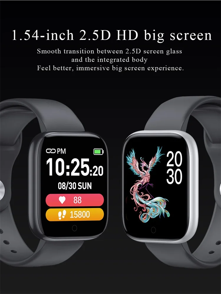 Heart rate monitoring | Blood pressure monitoring Exercise step count | Sleep monitoring Alarm clock reminder | Incoming calls Remote camera | Weather reminder Sedentary reminder | Information reminder IP67 waterproof | Music control Water drinking reminder | Stopwatch Screen lights up when lifting wrist