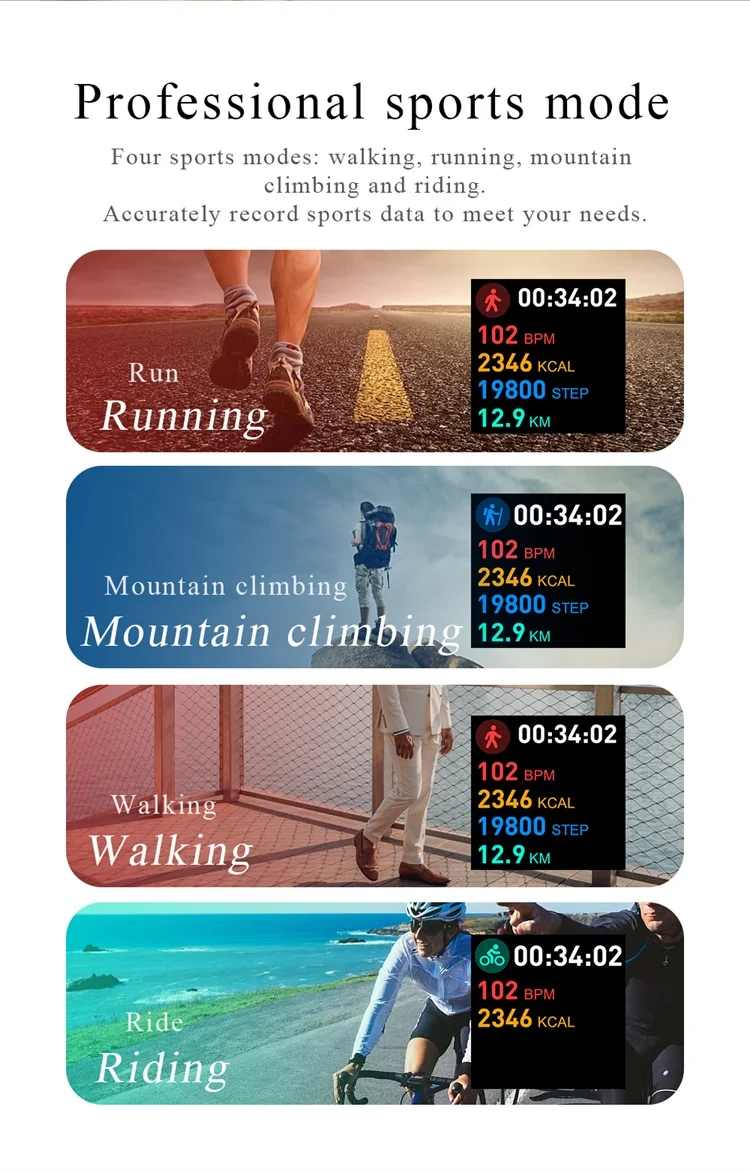 Four sports modes: walking,running, mountain climbing and riding. Accurately record sports data to meet your needs.