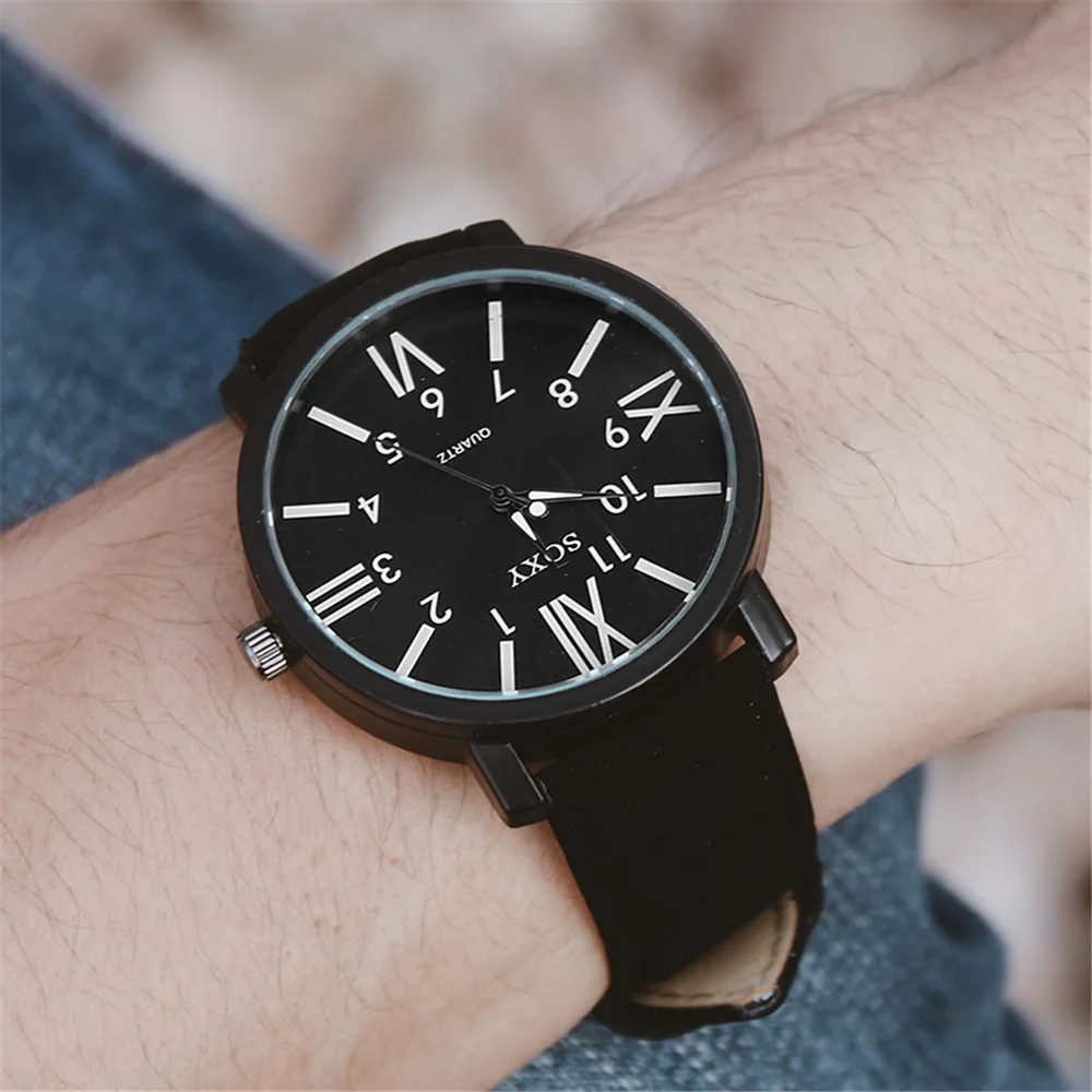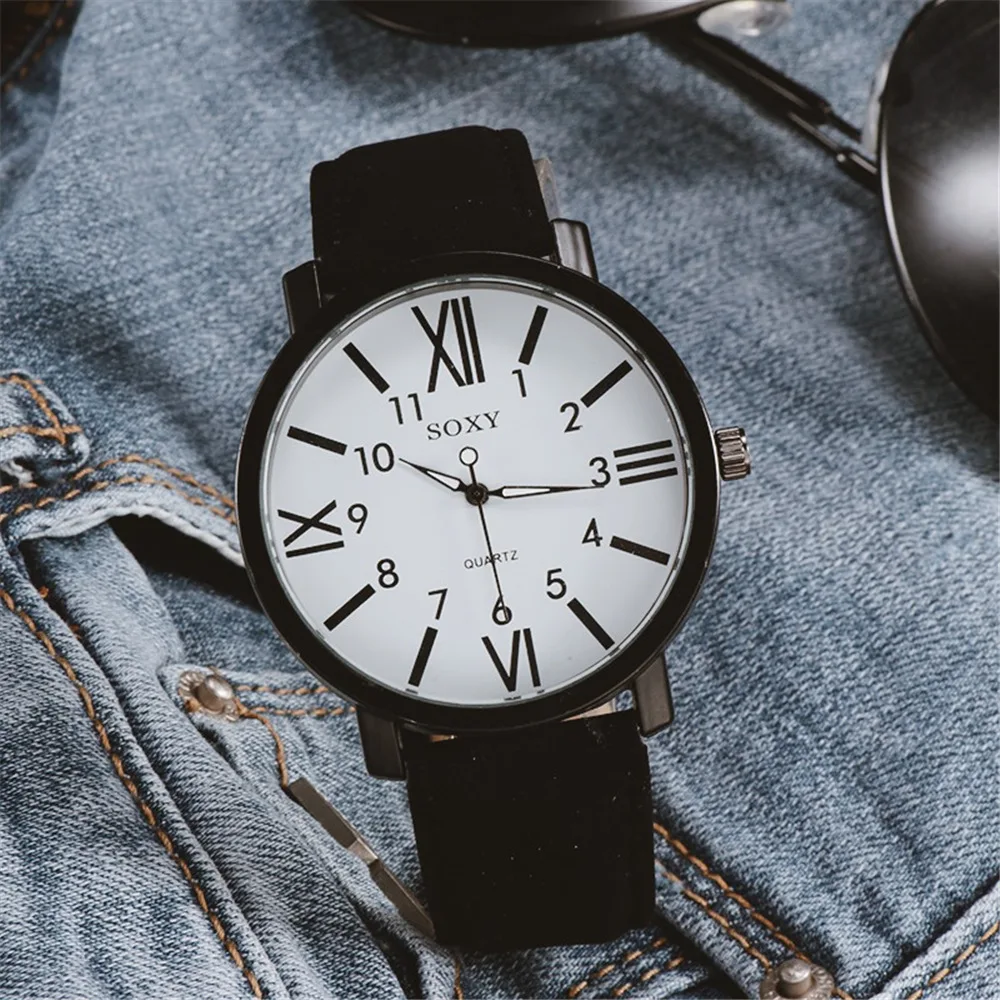 SOXY Brand Men's Watch Luxury Quartz Watches Roman Numerals Dial Black Leather Strap Clock Zegarek Meski Erkek Kol Saati