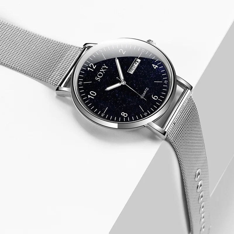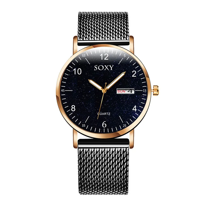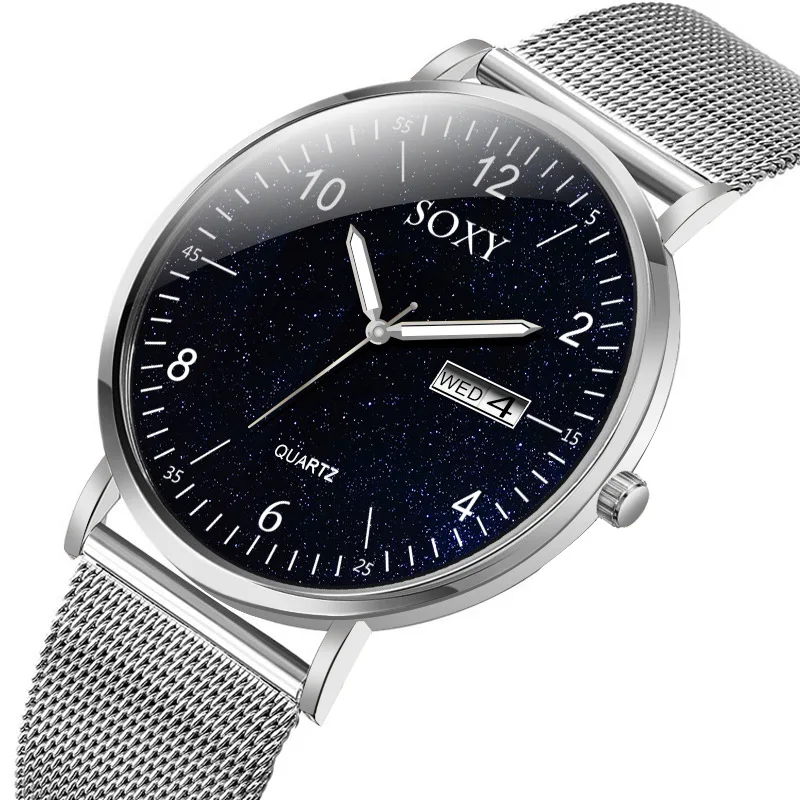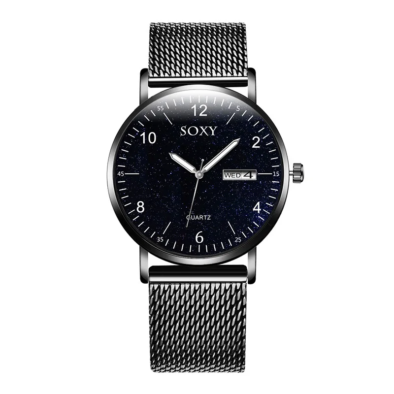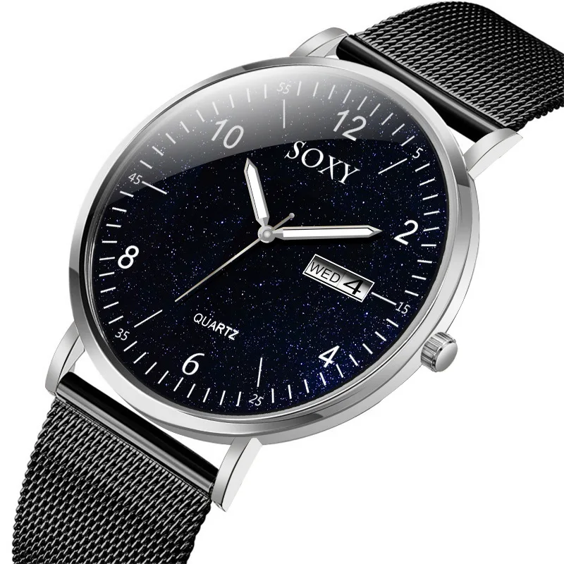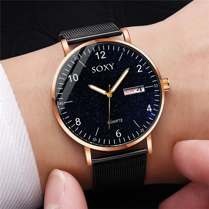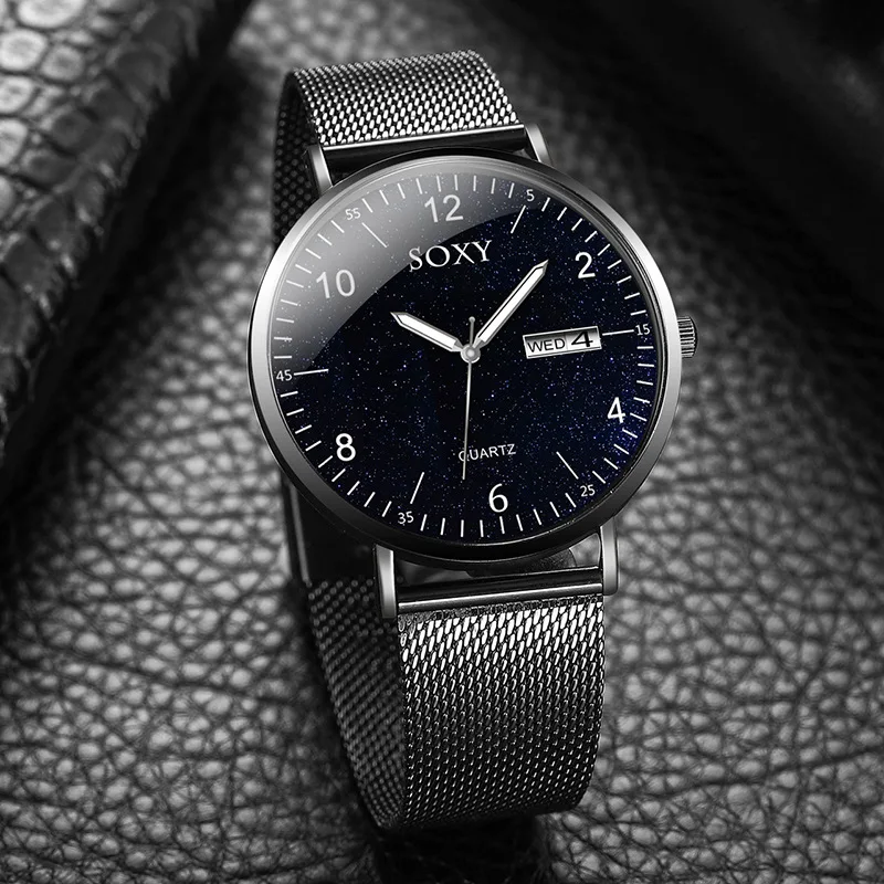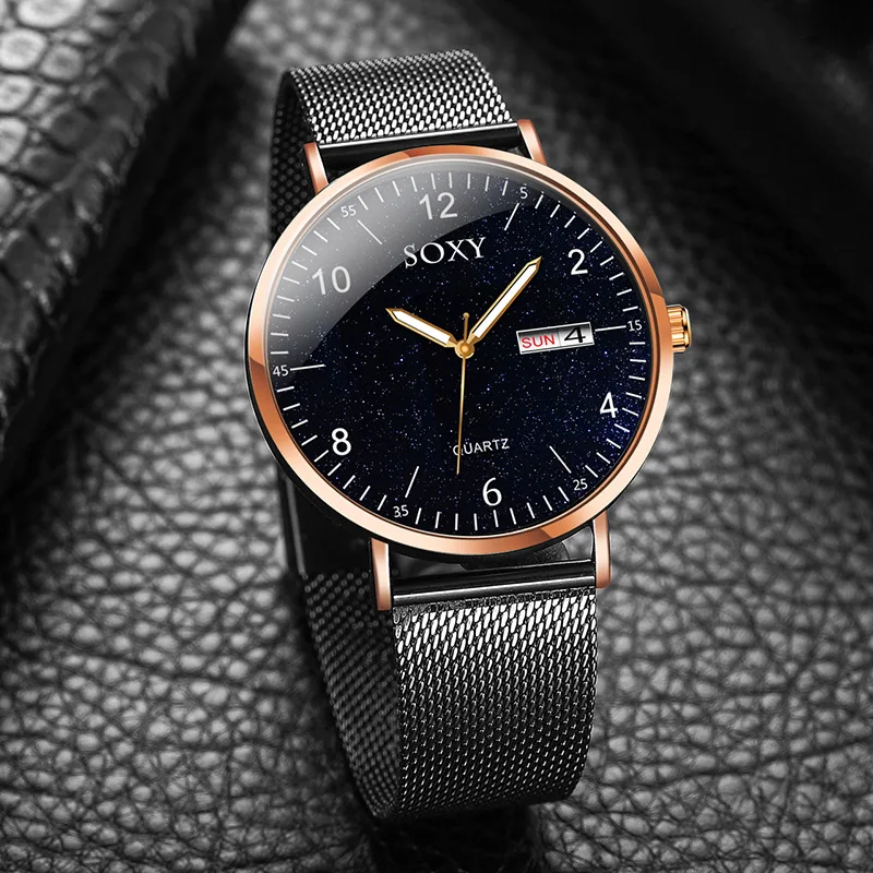 SOXY To Brand Luxury Men's Watch Quartz Steel Mesh Strap Date Luminous Star Sky Dial Clock Zegarek Meski Wristwatch 2019